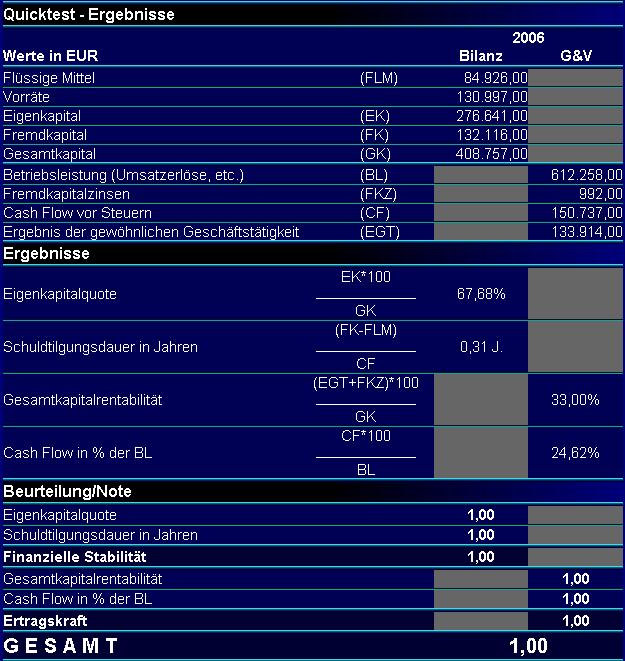 JackOfTrades Juli 12, 2008 · bearbeitet Juli 12, 2008 von JackOfTrades Die grobe Fundamentalanalyse auf Basis des Geschäftsberichts 2006 in Form des Quicktests: Hi, ich habe mir jetzt erst den gesamten Thread durchgelesen, daher sorry, wenn die Antwort etwas spät erscheint. Den Quick Test von dem Kralicek habe ich mal etwas näher betrachtet und dabei ist mir aufgefallen, dass mir die Herkunft einiger Werte nicht so ganz klar ist. Vielleicht verstehe ich es auch nur falsch oder habe mich verguckt. Wie auch immer, jedenfalls hast Du im Test als FKZ folgenden Wert eingegeben: 4.393, im AR 2006 finde ich aber in der GUV unter "Net interest" (was ja den Fremdkapitalzinsen entspricht, da Nettozinsen=Zinsertrag-Zinsaufwand?!) einen Wert von 992. Ebenso hast Du bei CF einen Wert von 153.141. CF ist ja definiert als EGT (aus der GuV) +Abschreibungen & Rückstellungen (beide aus dem CF-Statement). Wenn ich aber nun den AR 2006 hernehme, dann rechne ich: 133.914 (PBT) + 18.564 (Depreciation & amortization) - 1.741 (Increase in (use of) deferred taxes and other provisions) = 150.737. Der Unterschied ist nicht groß und in den Noten macht es keinen Unterschied, aber ich frage mich dennoch, wie wir auf verschiedene Werte kommen. Was mache ich falsch? Danke für die Hilfe und Gruß! P.S.: Anbei noch der von mir durchgeführte Quicktest mit den eigenen Zahlen: Diesen Beitrag teilen Link zum Beitrag