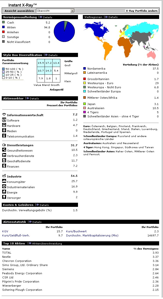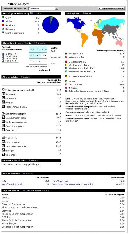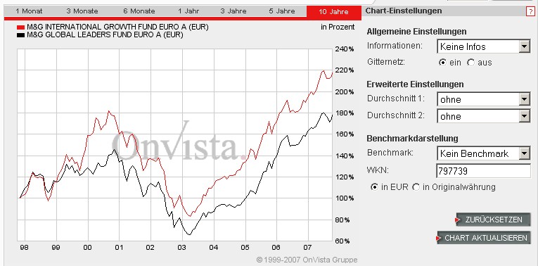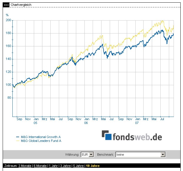 Swai Oktober 3, 2007 Auf der Suche nach einem globalen Fond bin ich über diesen gestolpert und möchte ihn hier mal vorstellen: (Die Suche hat zwar 3 Treffer ergeben, er wurde jedoch noch nicht vorgestellt) Im Gegensatz zum M&G Global Leaders steckt der M&G International Growth Fund mehr Geld in Growth-Werte (der Name sagt es ja schon). Dies ist abgesehen von der Ländergewichtung auch der Hauptunterschied zum Global Leaders. Der Fond existiert seit 1969 und wenn der Chartvergleich auf Onvista (weiter unten) stimmt, dann hat er den Global Leaders gut outperformt. Falls er denn stimmt... Von der M&G Homepage: Der M&G International Growth Fund investiert in eine breite Auswahl internationaler Aktien (ohne Großbritannien). Ausschließliches Anlageziel des Fonds ist langfristiges Kapitalwachstum. Basierend auf der Überzeugung, dass das einzelne Unternehmen einen deutlich wichtigeren Einfluss auf die Wertentwicklung hat, als nationale Grenzen und Volkswirtschaften, ist der Fond international ausgerichtet. Kern des Investmentansatzes ist fundamentales "Bottom-up"-Stockpicking, wobei der Schwerpunkt auf langfristigen Anlagethemen liegt. Es werden keine "Top-down"-Kriterien bei der Auswahl von Sektoren, Ländern oder Währungen angewendet. Der Fonds verfolgt keinen festgelegten Investment-Stil, und bei der Einzelwerteauswahl wird jegliche Anlehnung an einen Index vermieden. Durch diesen Ansatz stehen bevorzugt Unternehmen im Mittelpunkt, die freien Cashflow generieren und Dividenden zahlen, hervorragende Vertriebs- und Marketingkapazitäten haben und über starke, global attraktive Marken verfügen. Der Fondsmanager hat zudem eine starke Präferenz für Unternehmen mit einem klar erkennbaren und verständlichen Geschäftsmodell, das einem detaillierten Research und Analyseprozess unterzogen werden kann. Fondsmanager: Greg Aldridge Profil: Bevor Greg Aldridge zu M&G kam, war er über drei Jahre als Unternehmensberater für strategische und organisatorische Fragen bei McKinsey & Company tätig und betreute Kunden aus der Industrie sowie dem Konsumgüterbereich. Davor arbeitete er vier Jahre im Bereich Investment Banking der Deutsche Morgan Grenfell, mit dem Schwerpunkt Versorgungssektor. Stammdaten: - Aktienfonds Aktien allgemein Welt - ohne Großbritannien - Anlageschwerpunkt: Aktien Wachstum - Gesellschaft: M&G Investment Funds - Fondswährung: EUR - Volumen (31.08.07): 716,97 Mio. EUR - TER: 1,68% p.a. - Fondsart: thesaurierend - Gründung: 31.12.69 - Fondsmanager: Herr Greg Aldridge - Ausgabeaufschlag: 5,25% - steht bei Fonds-Super-Markt in der Kernliste Ratings: Morningstar: Feri Fonds Rating: A Hier eine allgemeine Übersicht: Performance: (Obwohl der Fond seit 1969 läuft, habe ich mit Ausnahme auf Onvista keinen Chart gefunden, auf denen Kurse von vor dem August 2004 eingezeichnet werden, insbes. im Vergleich mit dem M&G Global Leaders. Gesucht habe ich auf: fondsweb.de, FFB, Infos und auf der Homepage von M&G - dort geht der Chart maximal 5 Jahre zurück, ich wollte aber gerne 10 Jahre) Ich weiss, der Global Leaders ist nicht hundertprozentig mit dem International Growth vergleichbar (insbes. der Strategieansatz und die Ländergewichtung in Japan, Australien und Europa sind anders), aber da der Global Leaders hier sehr oft empfohlen wird, denke ich, dass man die beiden Fonds mal nebeneinander stellen sollte. Hier der Chart von Onvista: (bevor jemand fragt warum der Chart des Global Leaders bis 1998 zurückgeht, obwohl er erst 2001 aufgelegt wurde: der Fond wurde am 12.1.2001 konvertiert, vorher hiess er anders) Prospekte: Kurzprospekt: [Link] Halbjahresbericht April 2007: [Link] Jahresbericht vom Oktober 2006: [Link] Falls ich an den Informationen, den Charts oder den Portraits etwas ändern sollte, dann sagt es bitte. Ich habe versucht, die Richtlinien so gut wie möglich einzuhalten. Gruß, Swai Diesen Beitrag teilen Link zum Beitrag