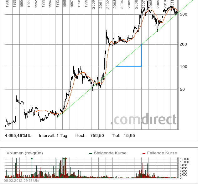 Toni Februar 8, 2012 Habe mich regelrecht erschrocken, als ich mir den Langfristchart angesehen habe: Ein Aufwärtstrend (grün) mit einer Performance (blau) von Verdoppelung alle 3,5 Jahre, und das seit fast 20 Jahren! Dazu noch eine Dividende von 6,6% und das KGVe bei nur 9.... (Quelle: comdirect.de) Hat diese Aktie niemand??? Diesen Beitrag teilen Link zum Beitrag