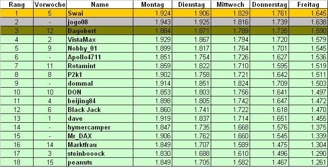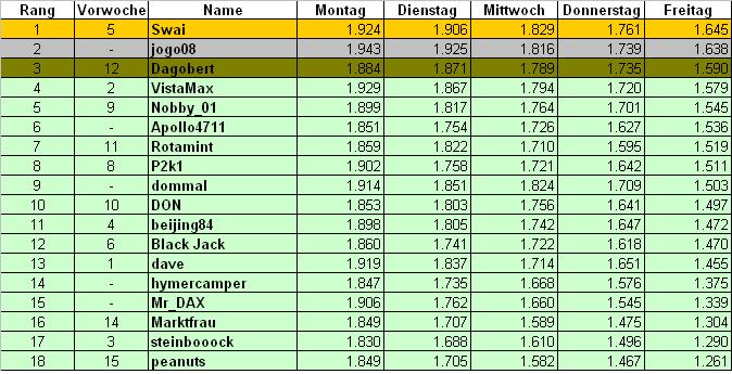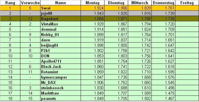 VistaMax Oktober 18, 2007 · bearbeitet Oktober 18, 2007 von VistaMax Rangliste Donnerstag: mein Tipp: 7.970 7.995 Diesen Beitrag teilen Link zum Beitrag