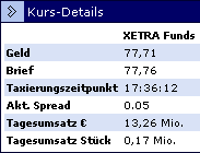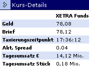 ETF's werden an der Börse gehandelt. :w00t: Der Handel funktioniert vom Prinzip her also wie bei Aktien. Es gibt keinen offiziellen Kurs. Ein Handel kommt nur zustande wenn jemand seine Anteile zu einem Preis anbietet (Brief) den jemand anderst bereit ist zu zahlen (Geld). Ist der Briefkurs aber höher als der Geldkurs kommt natürlich kein Handel zustande. Die Differrenz zwischen den beiden Kursen ist der Spread.