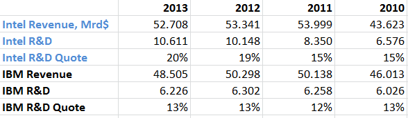 Flughafen November 4, 2014 · bearbeitet November 4, 2014 von Flughafen Ich habe den Artikel in WSJ nicht gelesen, aber die Danger, "that that those buybacks have been substituting for substantive future investment, be it software engineers, new products, or extra marketing", - diese Danger sehe ich so nicht. Wenn man für die letzten paar Jahre die Research&Development-Kosten von z.B. Intel und IBM mit Daten aus öffentlichen Quellen vergleicht, dann fällt auch, dass noch 2010 und 2011 IBM nicht wesentlich weniger investierte. 13 oder 15% ist im Endeffekt egal. IBM fährt Investitionen nicht auf Sparflamme. Diesen Beitrag teilen Link zum Beitrag