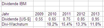 Schlaftablette November 7, 2013 Haltet ihr den aktuellen Kurs für attraktiv für einen Einstieg? Ich persönlich halte ihn (aus Sicht eines langfristigen Dividend-Growth-Investors) für durchaus attraktiv, um eine erste Investition zu tätigen. Warum? Hier mal ein langfristiger Verlauf der Dividendenrendite: Man sieht m.M.n. 2 Sachen: 1. In der Spitze (während der Lehman-Krise) betrug die Dividendenrendite ca. 2,67%. Ich gehe in erster Näherung davon aus, dass wir diese Schwelle in mittlerer Zukunft erst wieder erreichen, wenn wir eine ähnliche Situation wie während der Lehman-Krise bekommen. 2. Über lange Zeiträume wächst die Dividenderendite. D.h. die Dividende wächst schneller als der Kurs, oder umgekehrt, der Kurs entwickelt sich schlechter als die Dividende. Der 2. Punkt relativiert den 1. ein wenig. Langfristig wird IBM möglicherweise dahin kommen, wo McDonalds, Coca-Cola etc. heute schon sind: Bei ca. 2,5-3,5% Dividendenrendite. Geht man also davon aus, dass die 2,67% Divi-Rendite erst bei einer Krise erreicht werden, so entspricht das bei einem aktuellen Kurs von ca. 180 US-$ einer Dividende von ca. 4,80 US-$. Schauen wir uns mal die (Quartals-)Dividendenentwicklung der letzten Jahre an: In den letzten 10 Jahren lag die Dividendensteigerung immer über 10%. Im Schnitt der letzten 5 Jahre bei ca. 13,7%. Der Einfachheit halber nehme ich an, dass die Dividende in den nächsten Jahren um 10% wächst. 2013: 3,80 $ 2014: 4,18 $ 2015: 4,59 $ 2016: 5,05 $. Selbst wenn 2016 ein Lehman-ähnlicher Crash käme,würde der Kurs bei 2,67% bei 189 $ liegen. Also höher als heute. Unter Annahme, dass mein Modell einigermaßen eintrifft, behaupte ich: Wer jetzt Cash zurücklegt, um IBM während eines Crashs günstiger einzukaufen, "wettet" darauf, dass wir "Lehman II" spätestens 2016 erleben werden. Umgekehrt: Wenn ich heute kaufe, und morgen passiert "Lehman II", dann bin ich gemäß meinem Modell nach 3 Jahren wieder bei +/- 0 angekommen (+ die inzwischen aufgelaufenen Dividenden). Natürlich ist das Modell nur eine Näherung. Über meine Annahmen bzgl. Dividendenwachstum und max. Dividendenrendite kann man sich streiten. Andrerseits gehe ich davon aus, dass man den günstigsten Zeitpunkt erwischt. Da muss man sich zwei Fragen stellen: 1. Werde ich den Tiefpunkt erkennen? 2. Werde ich den Mut haben, um am Tiefpunkt zu kaufen? Und falls "Lehman II" nicht ganz so schlimm ist wie "Lehman I", dann steigt die Divi-Rendite nur bis 2,59%. Ich habe wieder nicht gekauft. Soviel zu meinen Überlegungen. Muss aber jeder nochmal selbst nachdenken. Ich bin mit einer ersten Position zu 2,05% investiert. Und ich würde bei ca. 2,3% nachkaufen. Diesen Beitrag teilen Link zum Beitrag
