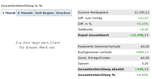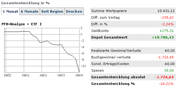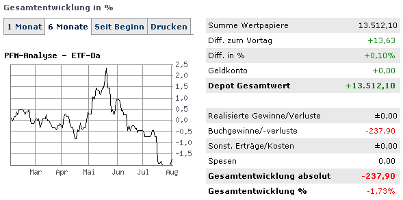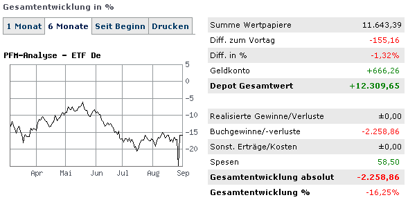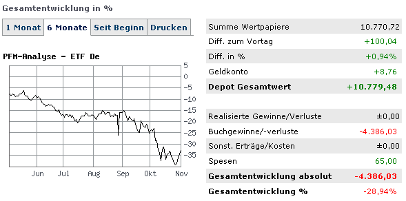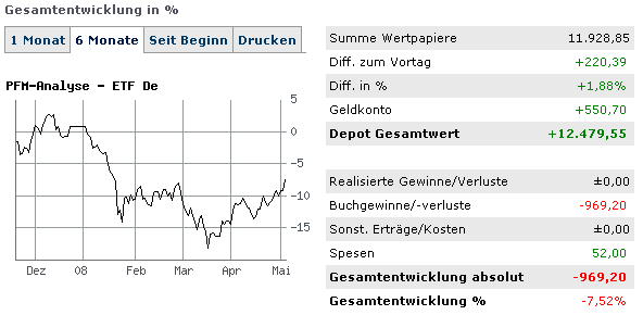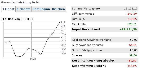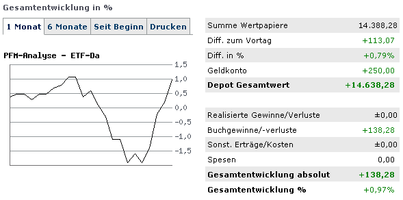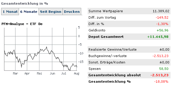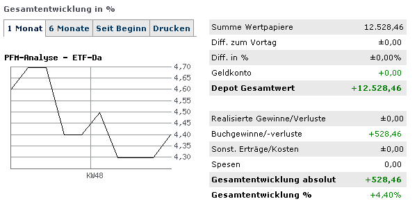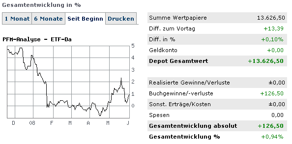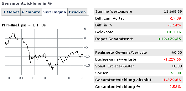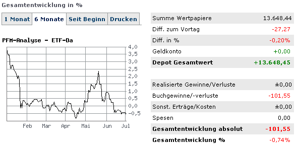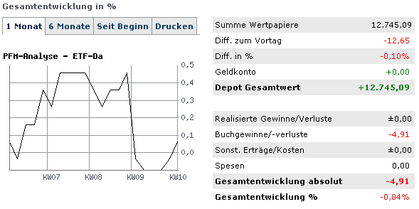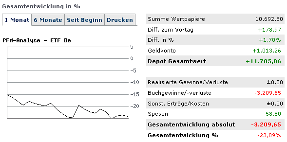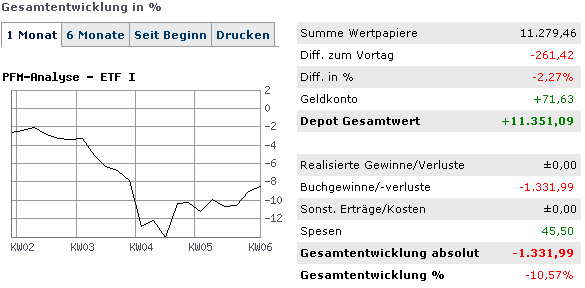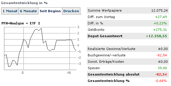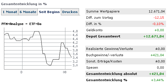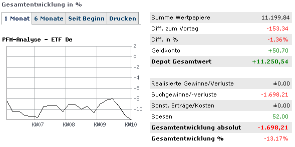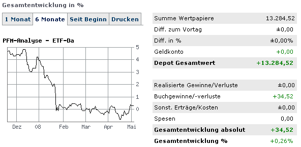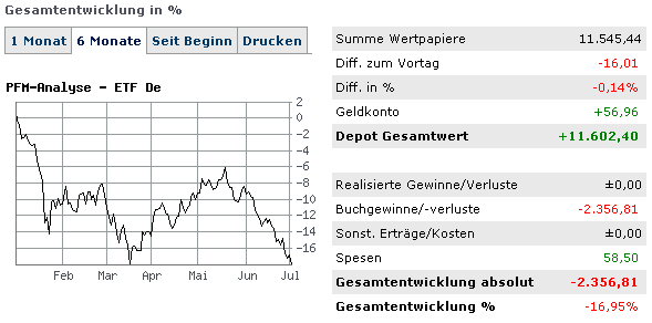 Das Depot des ETP-Dachfonds wird fiktiv bei der Frankfurter Fondsbank über Fonds-Super-Markt.de und das ETF Depot bei flatex geführt. Die Depots sind kostenlos.