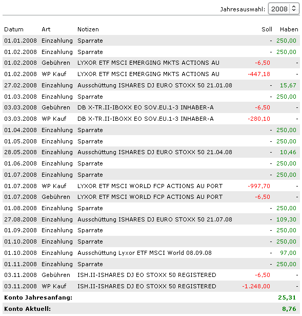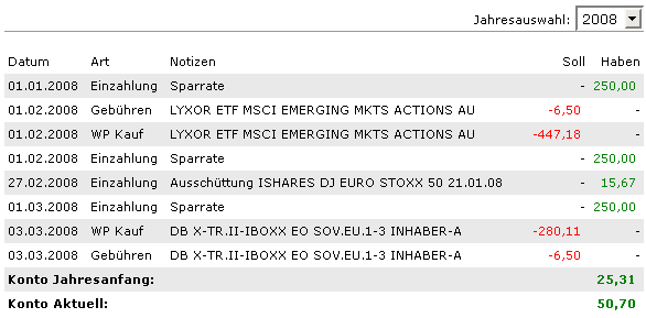 Im ETF Depot wurde turnusgemäß der LYXOR ETF MSCI EMERGING MARKETS gekauft: 58 Anteile für € 447,18 + € 6,50 Gebühren. Der nächste Kauf findet im März (DB X-TRACKERS II - IBOXX EURO SOVEREIGNS EUROZONE) statt.