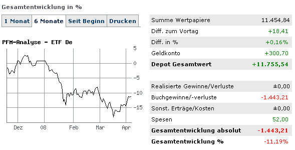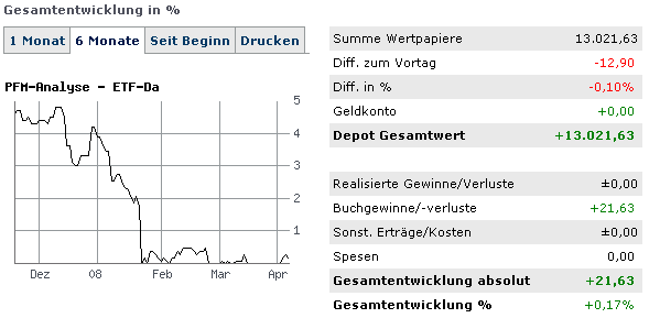 Ich selbst habe kein ETF Depot dieser Art, würde es aber so oder ähnlich wählen, nähme ich nicht aktive Fonds. Von daher dient mir dieser Vergleich auch als Hilfestellung für die langfristige Geldanlage ab 2009 unter dem Aspekt der Abgeltungssteuer.