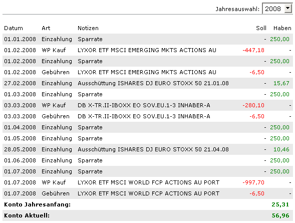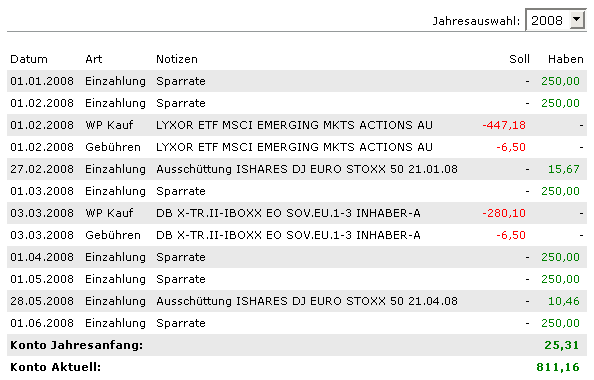 Im ETF Depot wurde turnusgemäß der DB X-TRACKERS II - IBOXX EURO SOVEREIGNS EUROZONE gekauft: 2 Anteile für 280,11 + 6,50 Gebühren. Der nächste Kauf findet im Juli (LYXOR ETF MSCI WORLD) statt.