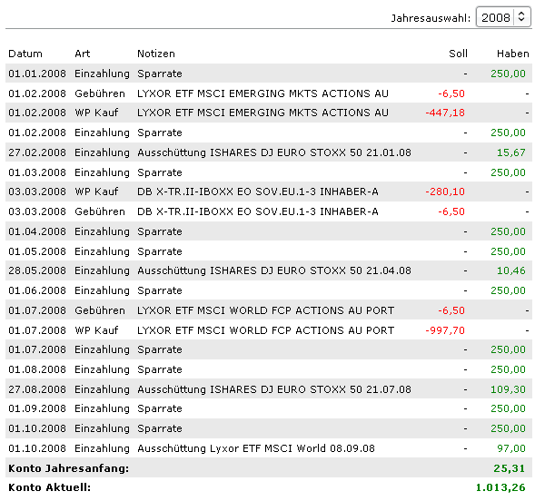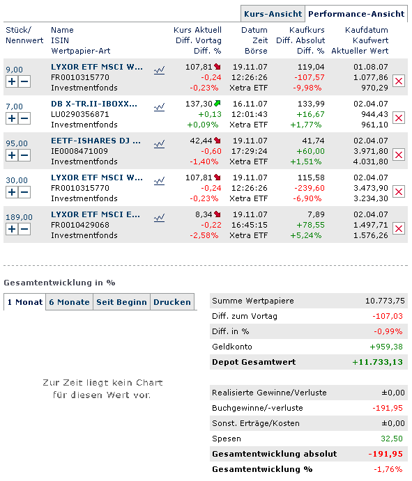 Im ETF Depot wurde turnusgemäß der LYXOR ETF MSCI WORLD gekauft: 11 Anteile für 997,70 + 6,50 Gebühren. Der nächste Kauf findet im Dezember (ISHARES DJ EURO STOXX 50) statt.
