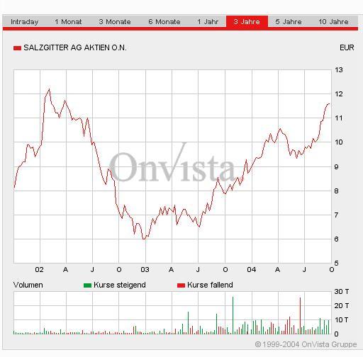 andy Oktober 13, 2005 Stahlwerte wie Salzgitter plötzlich aus der Mode Stärkster Verlierer im MDax ist aber die Salzgitter-Aktie. Händler erklärten das Kursminus von zeitweise über acht Prozent mit Gewinnmitnahmen. "Die Aktie ist von Anfang September von 30 Euro auf zuletzt mehr als 42 Euro gelaufen, da machen jetzt viele Investoren Kasse", sagte ein Marktteilnehmer. Ein anderer Börsianer verwies zudem auf die schwachen Vorgaben der japanischen Stahlwerte. Am Mittwoch hatten Gerüchte um eine Platzierung von Anteilen den Titel zeitweise stark belastet. Diesen Beitrag teilen Link zum Beitrag