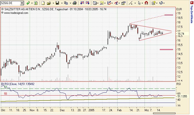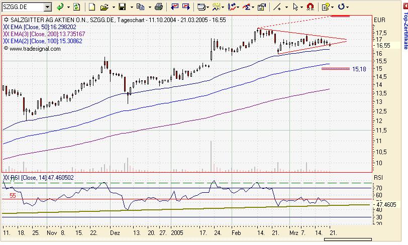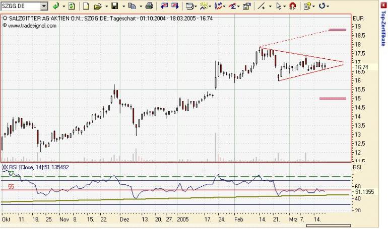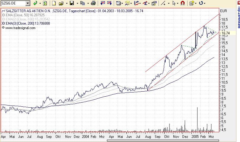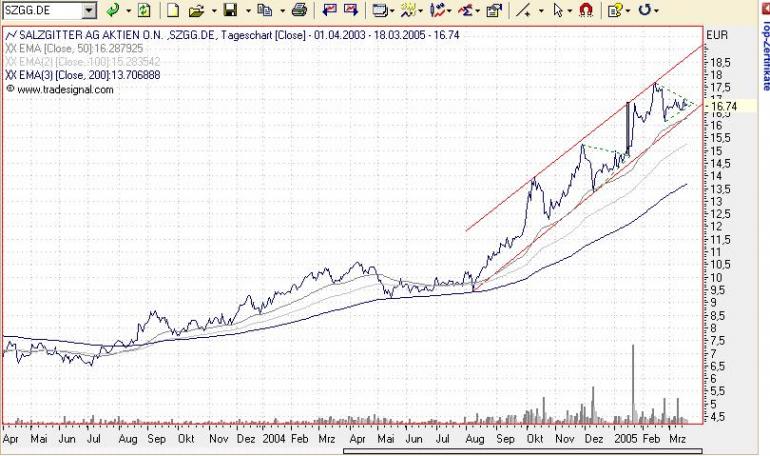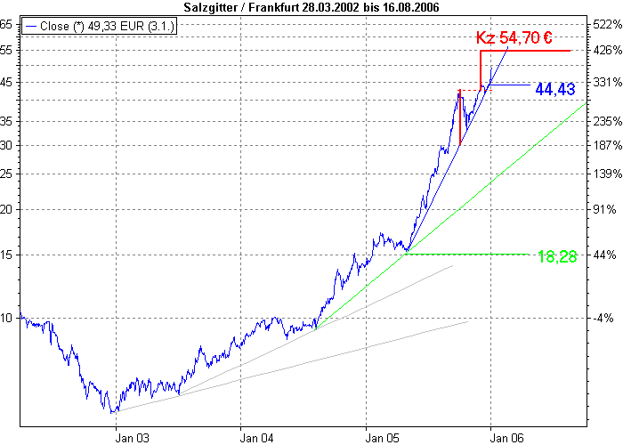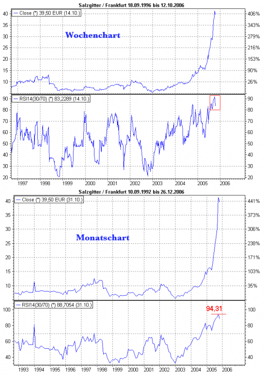 Aktiencrash Januar 4, 2006 Für eine Konsolidierung läuft mir das zu schnell ab: Über 7% an einem Tag sieht nach einem Einbruch aus, der auf schlechten Nachrichten beruht. Seltsam, dass ich nichts über eine Kapitalerhöhung finden kann - lediglich die zwei englischen Meldungen sprechen von dem Gerücht. Die Konsolidierung läuft zu schnell ab. Das ist wieder typisch für Kleinaktionäre. Das der Kurs von 15 auf über 40 in 10 Wochen geklettert ist, war dir das auch nicht zu schnell ? Sieh dir einmal den Wochen-RSI bzw. Monats-RSI an. Die Aktie ist total überkauft. Dazu noch den linearen Chart. Wohin soll den der RSI noch steigen im Monatschart. Schon der Sprung von 30 auf 41 innerhalb einer Woche, ist Übertreibung pur. Diese Übertreibung muß erst einmal abgebaut werden. Entweder steigt die Aktie jetzt sehr langsam weiter, oder aber sie wird fallen um die Übertreibung im RSI abzubauen. Es spielt absolut keine Rolle was jetzt verbreitet wird auf fundamentaler Seite, den RSI kann man nicht überlisten. Jeder Stausee ist mal voll und läuft dann über. Genug Zeit um die Staumauer in der Zwischenzeit zu erhöhen . Wie es gesagt habe, den RSI kann man nicht überlisten . Die Aktie von Salzgitter hat sich seit Oktober in einer Konsolidierungsphase befunden. Die Übertreibungen sind abgebaut worden und die Fahrt geht weiter Richtung Norden. Der Aufwärtstrend blau entspricht einer Rendite von ca. 394,18 % pro Jahr. Das ist mehr als die SolarWorld Aktie zur Zeit (341,66 % pro Jahr) hergibt. Die nächste horiz. Unterstützung liegt zur Zeit bei etwa 44,43 Charttechnisch gesehen sollte das Kz bei 54,70 liegen. Mal sehen was geht . Diesen Beitrag teilen Link zum Beitrag