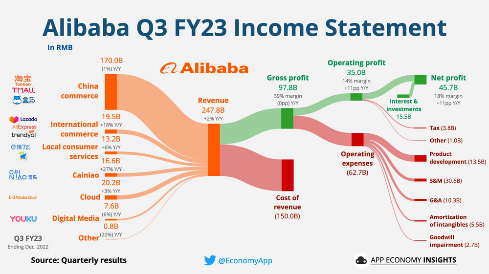 John_Galt Februar 23, 2023 · bearbeitet Februar 23, 2023 von John_Galt Zitat Alibaba Group Holding Limited announced on Thursday its revenue in the third quarter of the fiscal year observed an annual rise of 2% to reach $247.76 billion renminbi (RMB), or about $35.92 billion, surpassing expectations. The company's net income soared by 138% compared to the same trimester in 2021 to hit $6.63 billion. Meanwhile, its diluted earnings per share (EPS) jumped by 76% year-on-year to come in at $0.32 per share. "We delivered a solid quarter despite softer demand, supply chain and logistics disruptions due to impact of changes in COVID-19 measures," Chairman and Chief Executive Officer Daniel Zhang commented. "Looking ahead, we expect continued recovery in consumer sentiment and economic activity." Following the release of the report, Alibaba's shares advanced by 4.03% in premarket trading. https://www.teletrader.com/alibaba-s-q3-revenue-up-by-2-to-35-92-billion/news/details/59520944 https://data.alibabagroup.com/ecms-files/1532295521/0ebb3f92-e59d-4eaa-8ec6-8840faf12f82/Alibaba Group Announces December Quarter 2022 Results.pdf Diesen Beitrag teilen Link zum Beitrag