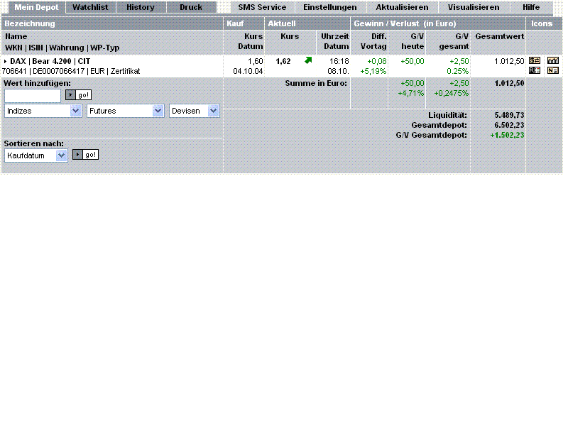 ich habe das depot bei der dab ( www.dab-bank.com ). es handelt sich hier um ein musterdepot das rein virtuell ist. ich nutze das depot um zu üben.... wenn ich ein gefühl dafür entwickelt habe werde ich es auch im realen depot versuchen.