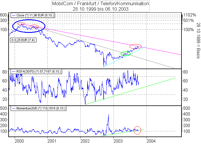 Aktiencrash Oktober 7, 2003 Interessante Konstelation im Tageschart ! Bezieht man die beiden Punkte (blauer Kreis) in die Chartanalyse ein, dann ist die MobilCom Aktie gerade wieder an altbekannten Widerstand angekommen ! Die bullische Divergenz beim RSI (hellgrün) ist noch intakt, nur viel Platz gibt es nach oben auch nicht mehr. Die bullische Divergenz (hellgrün) beim Momentum ist bereits angeknackt (roter Kreis). Ein erstes Zeichen, das die Aufwärtsdynamik gegen Null geht. Der kurze Aufwärtstrend im Chart (hellblau) ist zwar noch intakt, sollte dieser brechen, dann wird es Zeit die Segel zu streichen. Diesen Beitrag teilen Link zum Beitrag