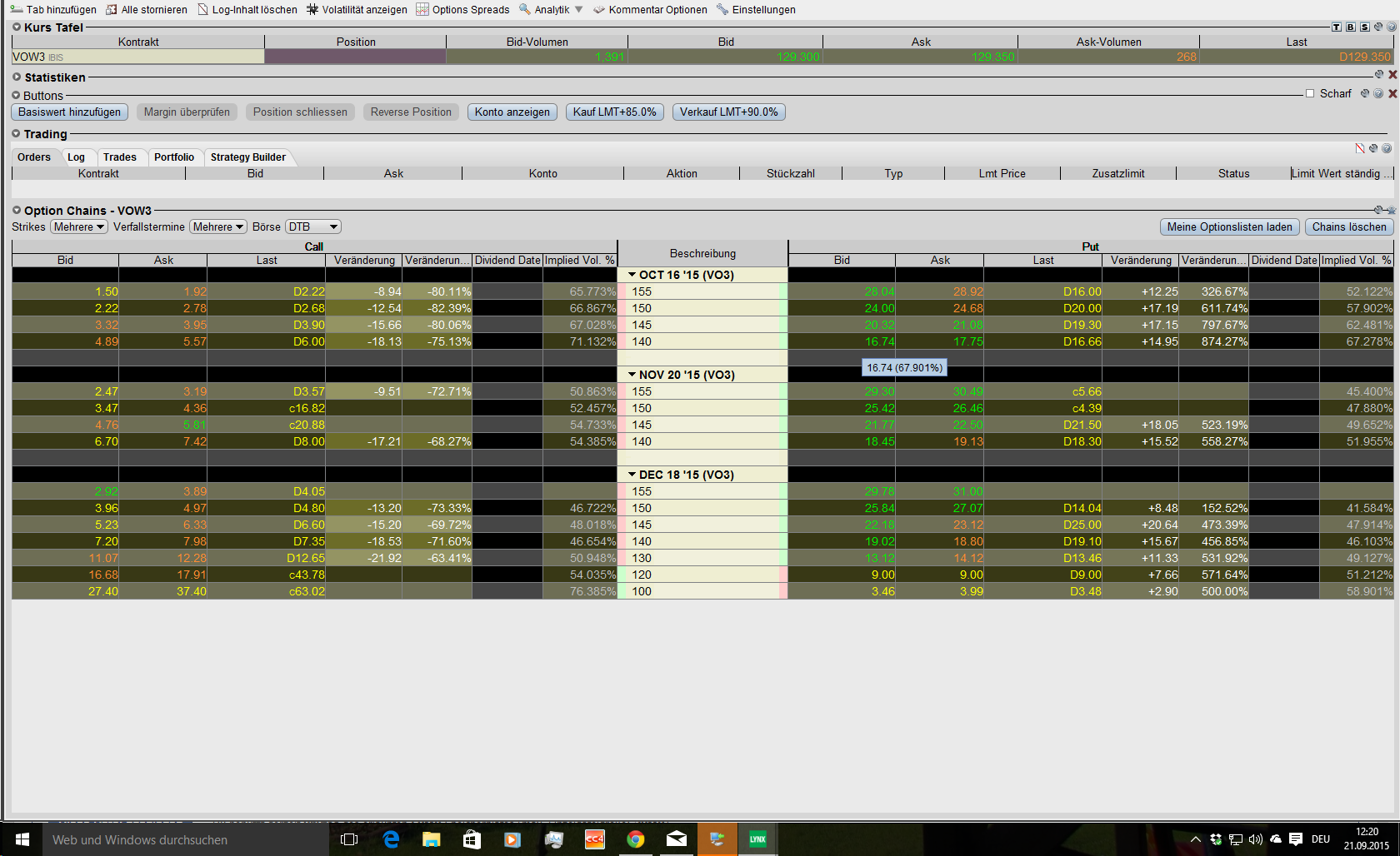 Bayer September 21, 2015 Bei der aktuellen Situation ist die Aktie wohl bei Kursen über 100 überbewertet. Wie kommst Du darauf? Der maximale (finanzielle) Schaden wird laut Presseberichten auf 18 Mrd. beziffert. Betrifft erst mal nur USA. Wer sagt, dass VW in D nicht auch getürkt hat. Solange nicht absehbar ist, was und vor allem wo da noch was gelaufen ist, wäre mir das zu heiß. Der Imageschaden ist erst mal nicht zubeziffern. Puts sind heute erst mal ganz schön teuer geworden. Sollte man mal ein paar verkaufen. 140 shortput Oktober 15 für 16,66 D.h. man hat einen Puffer bis 124 €. Mir aber trotzdem zu heiß. Diesen Beitrag teilen Link zum Beitrag