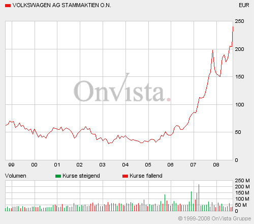 Reigning Lorelai September 17, 2008 · bearbeitet September 17, 2008 von Reigning Lorelai Neues Allzeithoch bei VW! 241,46 EUR +6,60 % [+14,96] Danke an alle VW Fahrer, ich fahre passend dazu den Golf V. Wenn das so weiter geht habe ich den Golf VI bald zusammen. :lol: bin leider leidenschaftlicher Audi-Fahrer aber ein Phaeton soll ja auch ganz nett sein. Aber Audi gehört ja zu VW und ich könnte mir mit dem Gewinn mittlerweile mehrere Garagen vom aktuellen TT vollstellen. Müsste mal schauen ob es für sechs Stück reichen würde, dann könnte ich für jeden Tag einen anderen fahren. Einen haben wir ja schon Diesen Beitrag teilen Link zum Beitrag