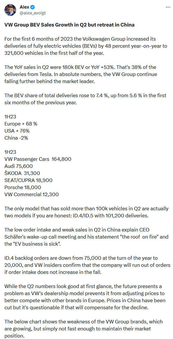 Holgerli Juli 15, 2023 Hier mal eine Analyse bezüglich der BEV-Verkaufszahlen der VW Group: Quelle: Diesen Beitrag teilen Link zum Beitrag