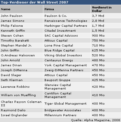 norisk April 16, 2008 16. April 2008 REKORDEINKOMMEN Hedgefonds-Manager kassierte 3,7 Milliarden Dollar Sie lieben das Risiko, machen Milliarden: Hedgefonds-Manager sind die Sieger der Immobilienkrise. Nie verdienten sie so viel wie 2007. Spitzenreiter ist John Paulson mit 3,7 Milliarden Dollar - vor Altmeister George Soros. SPIEGEL ONLINE zeigt die Top-Verdiener. Hamburg - Für Hedgefonds-Manager John Paulson war das vergangene Jahr äußerst profitabel: Während Banken Milliarden abschrieben, machte der Gründer von Paulson & Co. das Geschäft seines Lebens. Rechtzeitig brachte der Fonds-Lenker sein Portfolio in Stellung - und verdiente damit die Rekordsumme von 3,7 Milliarden Dollar. Damit ist er dem Ranking des US-Magazins "Alpha" zufolge der bestbezahlte Hedgefonds-Manager 2007. Der 52 Jahre alte Gehaltskrösus machte seine Milliarden, indem er sogenannte Kreditausfall-Swaps auf Hypothekenanlagen kaufte. Diese steigen im Wert, wenn das Ausfallrisiko zunimmt. Ähnlich verfuhren auch andere Fonds-Manager, mit ähnlichem Erfolg: Auf Spitzenverdiener Paulson folgt laut Ranking Fonds-Veteran George Soros. Im Sommer 2007 erkannte der Börsenguru die Zeichen der Zeit, beendete kurzerhand seinen Ruhestand und strich durch geschickte Geschäfte einen satten Gewinn in Höhe von 2,9 Milliarden Dollar ein. Nur unwesentlich weniger verdiente sein Kollege John Simons mit 2,8 Milliarden Dollar. Wie andere Hedgefonds-Manager profitierte auch das Mathe-Ass von den steigenden Preisen für Öl, Weizen und Kupfer. Für das Ranking untersuchte "Alpha" die von den Managern betreuten Fonds und berechnete daraus deren Performance-Gebühr. Das Erstaunliche: Die Manager werden immer schneller immer reicher. Um auf die Liste der Top-25 zu gelangen, musste ein Manager 2007 mindestens 360 Millionen Dollar verdienen - das 18-fache des Betrags von vor fünf Jahren. Zusammen verdienten die ersten zehn im "Alpha"-Ranking die nahezu unglaubliche Summe von knapp 13 Milliarden Dollar. Jüngster unter den zehn Hedgefonds-Schwergewichten ist Kenneth Griffin. Der 40-Jährige von der Citadel Investment Gruppe machte 1,4 Milliarden Dollar weniger als das 77 Jahre alte Urgestein Soros. Der liegt schlappe 25 Jahre über dem Altersdurchschnitt der Top Ten. Fünf der besten zehn waren auch schon 2006 in der "Alpha"-Liste vertreten. Nicht mehr in der "Alpha"-Liste plazieren konnte sich in diesem Jahr allerdings Edward Lampert, Gründer von ESL Investments. Seine Fonds verloren laut "Alpha" im vergangenen Jahr rund 27 Prozent. Über 60 Prozent des ESL-Equity-Portfolio investierte er in Sears, deren Aktien um 40 Prozent abstürzten. ESL ist ebenfalls beteiligt an der Citigroup, die 2007 ein ähnlich schlechtes Jahr hatte wie Sears. Quelle: SPIEGEL ONLINE Diesen Beitrag teilen Link zum Beitrag