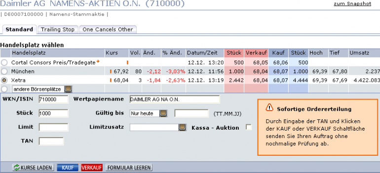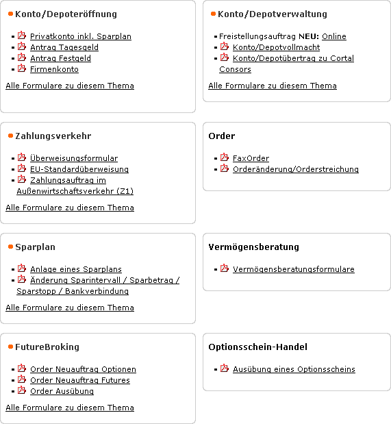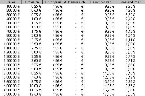 Jose Mourinho Dezember 11, 2007 Anbieter: Cortal Consors S.A., Zweigniederlassung Deutschland Bahnhofstraße 55 D-90402 Nürnberg Fon: +49 (0) 911 / 369 - 0 Fax: + 49 (0) 911 / 369 - 1000 infoservice@cortalconsors.de Sitz: Nürnberg HR Nürnberg B 20075 Ust.-Id.-Nr: DE 225900761 BLZ 760 300 80 Management: Generaldirektor (Directeur Général): Olivier Le Grand Weitere Direktoren (Directeurs Délégués): Vincent Lecomte Franz Baur Verwaltungsratsvorsitzender: Olivier Le Grand Niederlassungsleitung Deutschland: Martin Daut (CEO Deutschland) Olivier Le Grand Richard Döppmann Uwe Trittin Einlagensicherung: Aktuell beträgt die Einlagensicherung von Cortal Consors S.A. 45.000.000,- (45 Millionen) Euro pro Kunde. Produktspektrum: - Tagesgeldkonto (Lockangebot in der Regel mit sehr guten Konditionen, ansonsten marktübliche Konditionen) - Depot - Finanzierung - Sparpläne auf Fonds, Aktien - ETF Brokering - ETF Sparpläne - Außerbörslicher Handel - CFDs - Riestersparpläne - Zertifikate - Optionsscheine Formulare: Link Gebührenstruktur Kauf außerbörslich: Preisliste (pdf) Handling: Consors arbeitet mit dem PIN/TAN Verfahren. Desweiteren kann man ein Referenzkonto sowie Überweisungslimits festlegen. Möglichkeiten: Homepage ActiveTrader FutureTrader Telefonisch Features: Interactive Charts Aktienfinder Fondsfinder Anleihenfinder Zertifikatefinder Hebelprodukte/Optionsscheinsfinder Wirtschafsdaten (Rohstoffe/Currencies) Vorsorgeplaner Newsletter Telefonische Beratung Active Trader Orderabwicklung Nationale Börsen Xetra-Handel Internationale Börsen Außerbörslicher Direkt-Handel Neuemissionen Börsenplätze Ordermaske: Depotauszug: Nach jeder Wertpapier-Transaktion bekommen man von Cortal Consors eine Abrechnung. Zu Beginn eines jeden Jahres erhält man zusätzlich einen zum 31.12. des Vorjahres bewerteten Depotauszug. mit Cortal Consors OnlineArchiv Ihre Wertpapierabrechnungen werden Ihnen einmal täglich ins OnlineArchiv abgespeichert. Zu Beginn eines jeden Jahres wird zusätzlich ein zum 31.12. des Vorjahres bewerteter Depotauszug ins OnlineArchiv eingestellt. Vorsicht: Damit das Depot kostenlos ist, müssen eine von 3 der folgenden Bedingungen erfüllt sein: 1. Tagesgeldkonto im Quartalsdurchschnitt >2500 Euro 2. mindestens 1 Trade pro Quartal 3. laufender Sparplan Besonderheiten: Cortal Consors richtet auch für Firmen Konten und Depots ein. Tip: - Fazit: Sicherlich gibt es insbesondere im Bereich Aktien/ETFs günstigere Anbieter, wer jedoch mit relativ hohen Investments arbeitet (ab 1000,00) hat mit Cortal Consors sicherlich einen sehr guten Allroundbroker. Ich werde nicht mit Anrufen bombardiert, die Kontoauszüge kommen per Papierform und es kommt auch wenig bis gar keine Post außer sinnvolle Informationen. Ich habe mich für Consors aufgrund genau dieses Allroundgedanken entschieden. FAQ/NEWS: 1. Gebühren Limits Ich finde keine Angaben zu den Limitgebühren bei CortalConsors.Kann jemand sagen wie hoch die Gebühren für das Setzen,Streichen und Neu-Setzen der Limits für normal Trader sind? SL setzen und auslaufen lassen - 0,00 € / Änderung und Streichung - 2,50 €. Wenn Du Dich als Startrader anmeldest, sind Änderungen/Streichungen kostenfrei 2. ETF Sparpläne Cortal Consors bietet die ersten beiden Sparpläne auf db x-trackers an (weitere sollen im 1. Quartal folgen): https://www.cortalconsors.de/euroWebDe/-?...alt.TextVisitor Diesen Beitrag teilen Link zum Beitrag