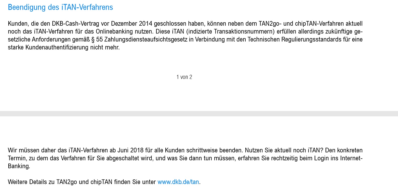 Kolle April 27, 2018 Neben weiteren Änderungen wird das ITAN-Verfahren ab Juni 2018 schrittweise eingestellt. Quelle: DKB-Postfach von heute. Diesen Beitrag teilen Link zum Beitrag