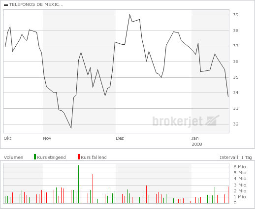 Börsentiger Januar 15, 2008 TELMEX - Teléfonos de México S.A.B. de C.V. (NYSE: TMX), ist ein mexikanisches Telekommunikationsunternehmen. Telmex ist nicht nur in Mexiko, sondern auch in Mittelamerika und Südamerika, insbesondere in Argentinien, Brasilien, Chile, Kolumbien, Peru und Uruguay tätig. Telmex gehört zur Firmengruppe Grupo Carso des mexikanischen Unternehmers Carlos Slim Helú. Nach dem Mobilfunkboom zu Beginn der 90er Jahre startete Iusacell in Mexiko. Telecel (Radio Móvil Dipsa) war nur Mobilfunk Service Provider. Telcel begann 1995 als zweiter Mobilfunkanbieter in Mexiko. America Móvil gehörte zur Carso Global Telecom. Telmex baute ab Mitte der 90er Jahre unter dem Firmennamen Telmex Internet Directory Personal Internetzugänge auf und trat als Internetdienstanbieter (ISP) auf. Im Jahre 1996 wurde Prodigy Communications aufgekauft und in Prodigy Internet de Telmex umbenannt. Telmex hatte 2005 über 80 Prozent Marktanteil, insbesondere über Prodigy Infinitum. Tut mir echt leid,dass es nicht allzuviele Infos sind,man findet schwer was darüber! Was meint ihr,soll man die Aktie kaufen oder nicht!Der Inhaber ist jetzt der reichste Mann der Welt!Ist das ein Grund sie zu kaufen? Kursdaten 15.01.2008 Eröffnung 34,96 Tages-Hoch 35,46 Tages-Tief 33,77 Akt. Umsatz 2.703.900 Kurs Vortag 35,50 52W Hoch (23.05.) 43,26 52W Tief (16.01.) 26,67 Perf. 1Y +8,33 / +30,66% Diesen Beitrag teilen Link zum Beitrag