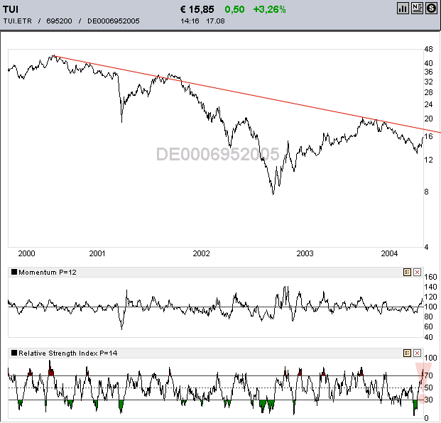 Teletrabbi August 17, 2004 Ich poste nochmal eben den neusten TUI-Chart. Gut zu erkennen sind auf jeden Fall der auf überkauft stehende RSI, sowie der intakte Abwärtstrend. Die Aktie ist also richtig heiß momentan. 16,5 Euro dürften noch drin sein. Aber nur mit Fallschirm (Stoppkurs)! Diesen Beitrag teilen Link zum Beitrag