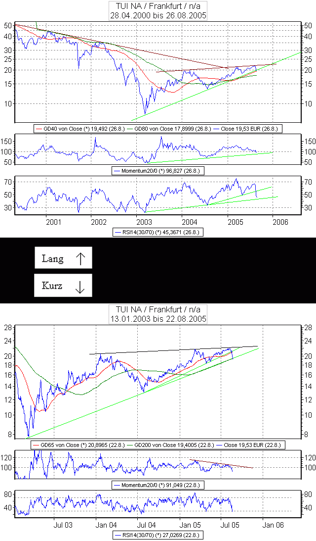 Schlitzer August 24, 2005 · bearbeitet August 24, 2005 von Schlitzer @traderS Deine Zitate stammen alle aus dem Beitrag von Luftballon weiter oben drüber, und die sind vom August 2004. Damals hatte man wirklich überlegt TUI in den Mdax zu schicken. inzwischen ist da vom TIsch, Zur TA bei Tui: guck dir meinen Beitrag über dir an, ich find da sieht man schon ganz gut wie es läuft, und wie der Kurs mit seinen exakten Berührungen an den Trendlinien verläuft. Bis jetzt gehts bei mir auf mit meinen Linien. Gruß, martin Diesen Beitrag teilen Link zum Beitrag
