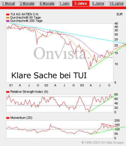 Teletrabbi November 12, 2003 TUI - keine sonnigen Aussichten Um es auf den Punkt zu bringen: Die Aussichten bei TUI sind wie ein Urlaub: Kurzzeitig gut. Wie es danach aussieht lässt sich noch nicht mit Sicherheit sagen. Der langfristige Abwärtstrend ist noch intakt. Insiderkäufe gab es noch nicht. Die Bewertung ist durchaus akzeptabel. Die Aussichten für den Reisemarkt sind nicht gerade rosig. Der RSI-Indikator ist im überkauften Bereich und dürfte dort noch eine Weile bleiben. Das Momentum ist noch einige Zeit im Aufwärtstrend. Die Aktie wird höchstwahrscheinlich bis auf 20-22,50 Euro steigen um dann eine neue Richtung zu finden (wahrscheinlich nach unten). Diesen Beitrag teilen Link zum Beitrag