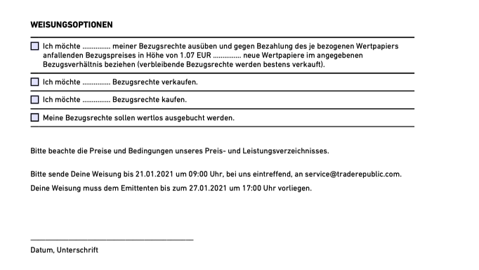Wenn du deine Bezugsrechte zu Aktien wandeln möchtest, geht das nicht über einen Kaufauftrag an Bezugsrechten sondern eine Anweisung an den Broker.