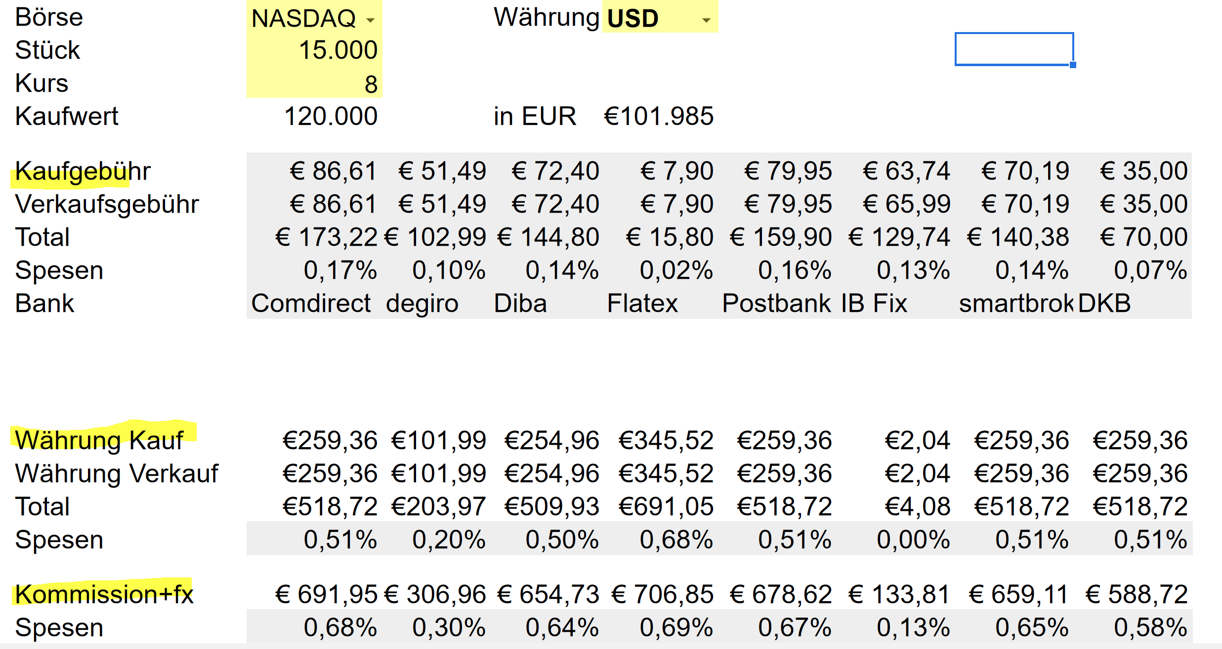 oktavian Juli 1, 2021 Ich habe mal aus meiner proprietären Berechnung eine Nasdaq Order verglichen für ~100.000€. Ich habe die Preisleistungsverzeichnisse aber nicht oft aktualisiert. Bei manchen Brokern, habe ich die Fremdgebühren auch nicht so richtig gefunden. Also keine Ahnung, ob z.B. DKB nicht doch noch was berechnet. Das ist also ohne Gewähr auf Richtigkeit. Auf jeden Fall sieht man, dass der cap der Ordergebühren nicht durchschlägt, weil die fx Kosten / spread) variabel aufgeschlagen werden: Fällt bei ING dann max 69,90€ bei der Odergebühr an oder kommen die 14,90€ noch drauf? Hatte mit €59,90 + 12,50€ gerechnet, was überholt ist. geht mir persönlich auch nur so grob, um zu sehen, welcher Broker passt. Diesen Beitrag teilen Link zum Beitrag