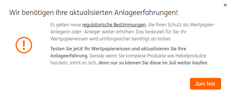 Rubberduck Mai 2, 2023 · bearbeitet Mai 2, 2023 von Rubberduck Die ING beglückte mich heute morgen mit einem Idiotentest zur Anlageerfahrung. Das heißt es reicht nicht mehr nur die Anzahl von Käufen anzugeben, sondern man muss auch einen Multiple Choice Test bestehen. Das ist für nachrangige Anleihen, variabel verzinste Anleihen, aber auch Zertifikate erforderlich. Für Reverse Zertifikate nochmal separat. (Da habe ich irgendwie die ING-Logik der Fragen nicht kapiert... Das heißt ich muss den wiederholen....) Den Rest (Hedgefonds, Hebelprodukte, Kryptos, Immofonds) brauche ich nicht. Also zeitnah erledigen, sonst muss man sich anlässlich der Einkaufstour beim nächsten Crash durchklicken... Diesen Beitrag teilen Link zum Beitrag