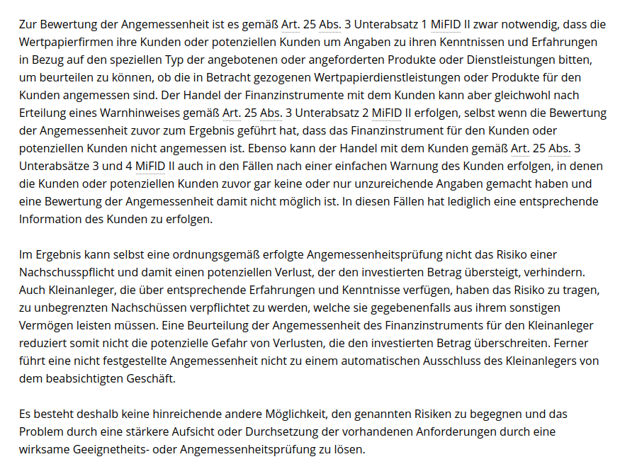 Rubberduck Mai 2, 2023 · bearbeitet Mai 2, 2023 von Rubberduck vor 2 Stunden von dimido: Ich hatte ab und zu auch schon mal Zertifikate in meinem Depot aber bisher noch keine Einladung zu so einem Idiotentest bekommen. Daher die Frage: wird ohne den Test später ein Kauf / Verkauf von z.B. Zertifikaten dann abgelehnt oder geht es hier nur um cover-my-ass aus Sicht der Bank und man kann alles wegklicken und das Geschäft trotzdem tätigen? Das ist Mifid. Verkaufen geht immer. für Neukauf ab demnächst wohl zwingend erforderlich. Bin ich der erste der den schrieb hat? Dann freuet euch, demnächst auch bei euch im Mehlkasten. Wegklicken reicht nicht. bafin zitieren bringt nix. Mifid führt ein Eigenleben. Die Ing hat auch Credit linked notes aus eigenem Ermessen und ohne Not rausgenommen. Reverse kann ich mittlerweile wieder handeln. Im multiple Choice kann auch nach falschen Aussagen gefragt werden… Diesen Beitrag teilen Link zum Beitrag