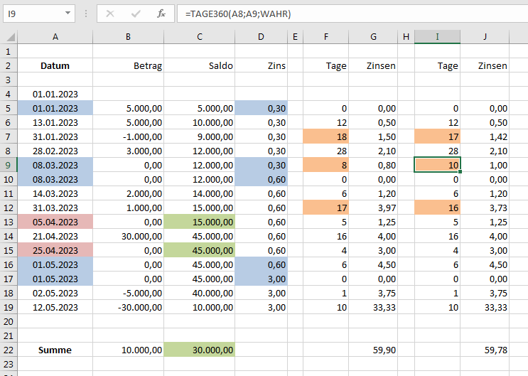 SlowHand7 Mai 13, 2023 Ich denke meine Tabelle ist nicht so schlecht. Vermutlich habe ich den Fehler jetzt endlich gefunden. Wenn die neuen Zinsen ab dem 01.05. gelten sollte man wohl den letzten Zins am 30.04. abrechnen und nicht erst am 1. Mai. Damit passt das nun recht gut bis auf wenige Cent und die finde auch noch. Eigentlich egal, aber da färbt wohl die Einstellung einer guten alten Freundin auf mich etwas ab. Die kann nicht ruhig schlafen wenn ihr 20 Cent in der Buchhaltung fehlen. Zum Test habe ich mal ein Beispiel aus dem Netz gesucht und in meiner Tabelle geprüft. https://tagesgeld.de/tagesgeld/formeln-zur-zinsberechnung.html Zuerst etwas Verwirrung. Da wird offenbar mit 365 Tagen gerechnet und dann sind es doch nur 364? Einen Tag mehr würde ich ja noch verstehen bei einem Schaltjahr, aber einen Tag weniger? Das ist doch wohl ein Fehler. Nun ja, bei TAGE360() und TAGE(;;WAHR) gibt es hier keinen Unterschied. Mit TAGE() gibt es natürlich ein anderes Ergebnis. Wobei der Unterschied doch gering ist. Also ich kann noch nicht beurteilen wie die ING da rechnet. Vielleicht muß ich da demnächst mal nachfragen. Diesen Beitrag teilen Link zum Beitrag