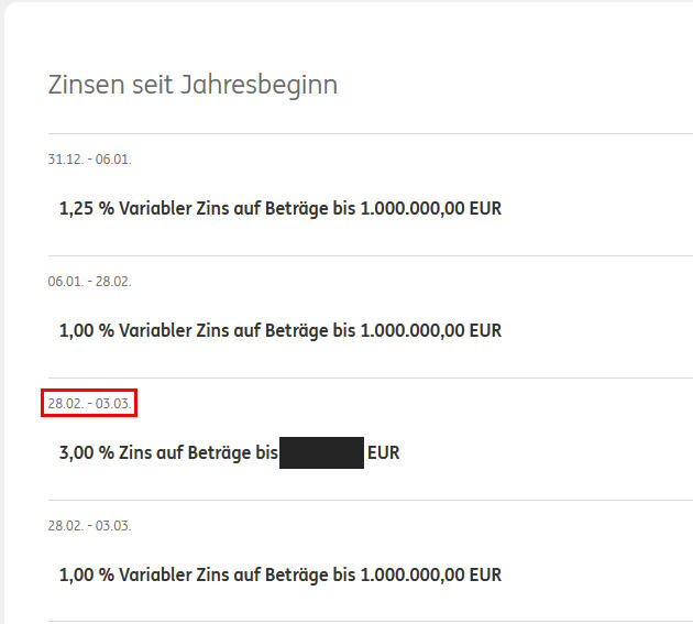 SlowHand7 März 3, 2025 vor 8 Minuten von Holgerli: Im Schreiben was in der Postbox lag, steht ja auch korrekt der 01.03. für den Start der 3% Zinsen drin. Mit dem Saldo vom 28.02. um 24 Uhr. Kannst du gerne als 01.03. 0 Uhr interpretieren. Diesen Beitrag teilen Link zum Beitrag