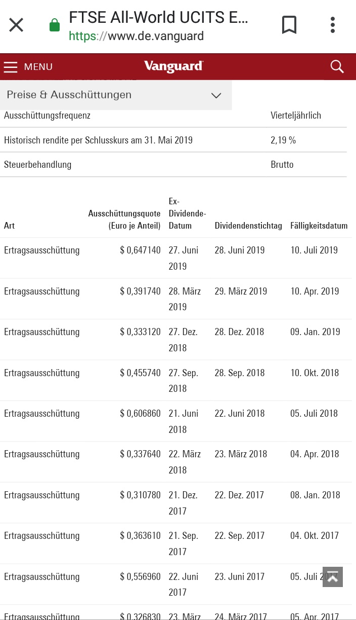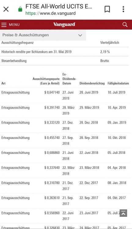 etf-friese Juli 11, 2019 vor 3 Stunden von Wilderhund85: Ex date 21/6 Payable date 5/7 Diese Daten stammen aus dem 2018er-Plan, der auf den Vanguardseiten immer noch verlinkt ist. 2018: https://api.vanguard.com/rs/gre/gls/1.3.0/documents/14807/de 2019: https://api.vanguard.com/rs/gre/gls/1.3.0/documents/17066/de Warum Vanguard es nicht schafft ihre Dokumentenverlinkung zu pflegen - keine Ahnung. Diesen Beitrag teilen Link zum Beitrag