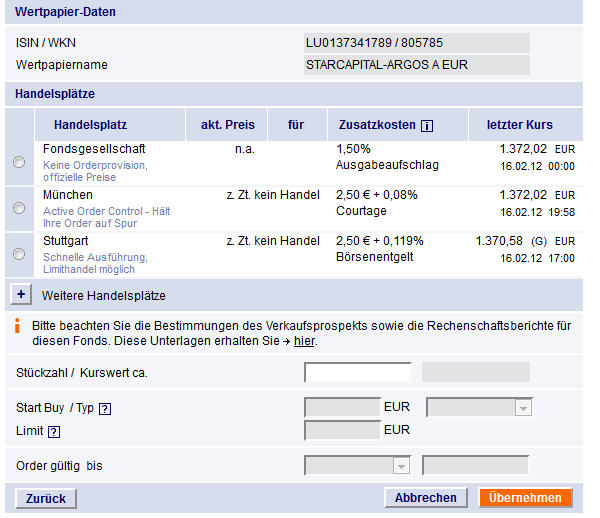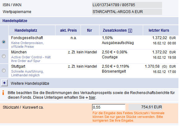 webber Februar 17, 2012 · bearbeitet Februar 17, 2012 von webber versuch es doch mal mit nem Punkt, statt ",". Eventuell geht es ja dann. Kannst auch mal nen Sparplan auf den Fonds anlegen (und nach der Ausführung wieder löschen), dann sollte es gehen. So theoretisch halt. aber sonst keine Ahnung ... Ganz ohne AA gibt es den hier: http://fonds-super-markt.de/ jedoch sollte man die Bedingungen genau beachten (zum Depotentgelt und Transaktionsentgelt) Diesen Beitrag teilen Link zum Beitrag