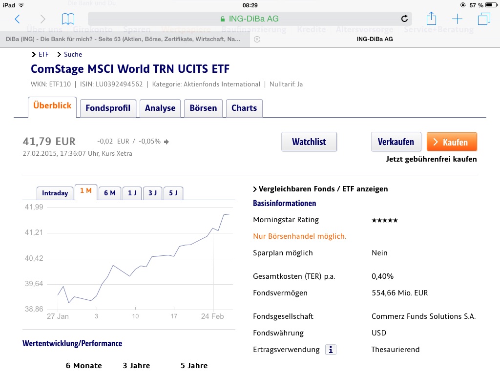 skeletor Februar 28, 2015 Gute Nachrichten die Wertpapierkäufe bei der ING-DiBa ab 01.03.2015 "Wertpapiergeschäft: Kunden können Fonds und ETFs ohne Ausgabeaufschlag oder Orderprovision kaufen / mehr Transaktionen und Depots Die ING-DiBa bietet ihren Kunden ab 1. März 2015 die Möglichkeit, alle Fonds und ETFs im Direkthandel ohne Ausgabeaufschlag oder Orderprovision zu kaufen. Zur Auswahl stehen insgesamt über 5.000 Fonds und ETFs. Das Angebot gilt für Einmalanlagen ab 500 Euro Kurswert und ist unbefristet. Mit dieser Aktion möchte das Institut an den Erfolg im Wertpapiergeschäft aus dem Vorjahr anknüpfen. Die Zahl der Wertpapierdepots stieg bis zum 31. Dezember 2014 um mehr als 40.000 auf über 963.000. Damit ist die ING-DiBa weiterhin der größte Onlinebroker in Deutschland. Die Anzahl der ausgeführten Wertpapiertransaktionen für Kunden erhöhte sich um 8% auf 7,4 Mio." Nachtrag bzw. Details zum Angebot der ING-DiBa ab 01.03.2015: " NG-DiBa bietet Kunden gebührenfreien Kauf von über 5.000 Fonds und ETFs an Frankfurt am Main – Die ING-DiBa bietet Ihren Kunden ab 1. März 2015 die Möglichkeit, Fonds und ETFs im Direkthandel gebührenfrei zu kaufen. Das Angebot gilt für Einmalanlage ab 500 Euro Kurswert und ist unbefristet. „Unser Angebot ist einzigartig am Markt. Andere Institute bieten nur den gebührenfreien oder gebührenreduzierten Kauf von bestimmten Produkten, zumeist bestimmte Fonds oder ETFs einzelner Emittenten, an. Unsere Kunden können aus über 5.000 Fonds und ETFs auswählen“, erläutert Katharina Herrmann, Mitglied des Vorstands der ING-DiBa. Handelspartner für den Kauf von Fonds ist die Baader Bank. ETFs können die ING-DiBa Kunden im Direkthandel gebührenfrei über Tradegate beziehen. " Ab Montag 02.03. startet die unbefristete Aktion nun. Bin mal gespannt was sich z.b. Die comdirect einfallen lässt bei ETF. Da haben sie zwar eine aktion mit 75 etf für 3,90€ aber trotzdem schlechter als DiBa. Diesen Beitrag teilen Link zum Beitrag