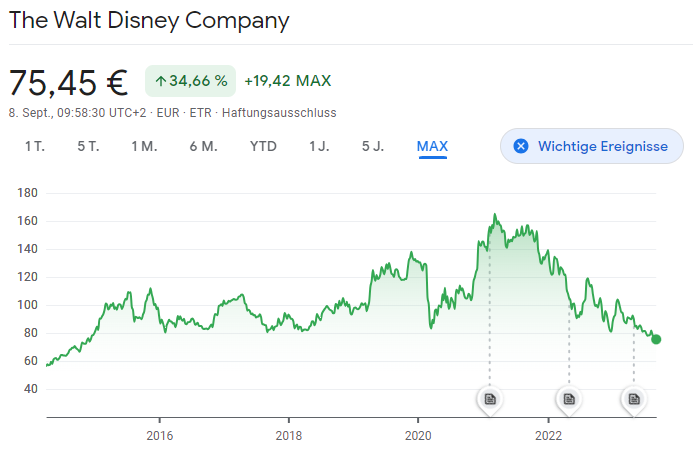 Hat diese Aktie eigentlich noch eine Zukunft? Wir dümpeln hier wieder um die 90 EUR herum, so weit waren wir Anfang 2015 schon. Die Euphorie mit Disney+ und mit dem 100. Geburtstag ist verflogen, die sehr "woke" Ausrichtung vieler neuer Produktionen kommt nicht bei allen gut an. Das ist schade angesichts der stolzen, jahrzehntealten Tradition dieses Gute-Laune-Konzerns.