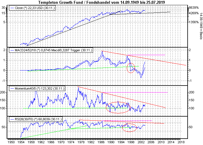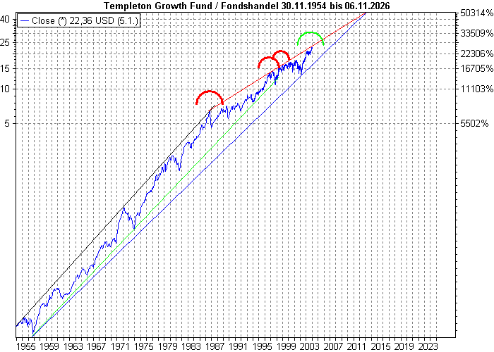 Aktiencrash Januar 7, 2005 Hier habe ich noch einen aufbereiteten Chart des Templeton Growth Fund. Ich habe einmal einen neuen Aufwärtstrend (blau) eingezeichnet. Ausgehend vom gleichen unteren Punkt, an dem der Aufwärtstrend (grün) damals begann, nach dem dieser 1998 nach unten brach (roter Halbkreis). Weiterhin habe ich festgestellt, das man oben zwei Widerstandslinien findet (schwarz/rot). Man sollte die Situation einmal weiter beobachten, denn im Augenblick steht der Fond wieder kurz vor erreichen des roten Widerstandes. Sollte dieser weiter anhalten, dann liegt die Befürchtung nah, das es zur Trendlinie (blau) gehen könnte. Folgende Verzinsungen pro Jahr würden anstehen je nach Einstiegzeitraum. Einstieg an Trend blau ca. 11,9 %/Jahr Einstieg an Trend rot ca. 7,6%/Jahr Man kann sich die mögliche Rendite ausrechnen. Sollte der Widerstand (rot) halten, beträgt die max. Rendite 7,6 % im Jahr, für den der jetzt eingestiegen ist. Rechnet man jetzt mal noch alle Gebühren die bei Kauf/Verkauf anfallen + jährliche Verwaltungsgebühren (falls vorhanden), dann sieht es für den schon einmal schlecht aus, wenn er jetzt erst eingestiegen ist. Vorteil für den der an der Trendlinie (blau) eingestiegen ist bei besagten 11,9 % Rendite im Jahr. Trotz seiner Performance von über 20.000 % seit 1954 und seiner jährlichen Steigerungen, ist die Rendite seit 1987 begrenzt. Es bleibt nur die Hoffnung, das der rote Widerstand nach oben bricht ! Diesen Beitrag teilen Link zum Beitrag