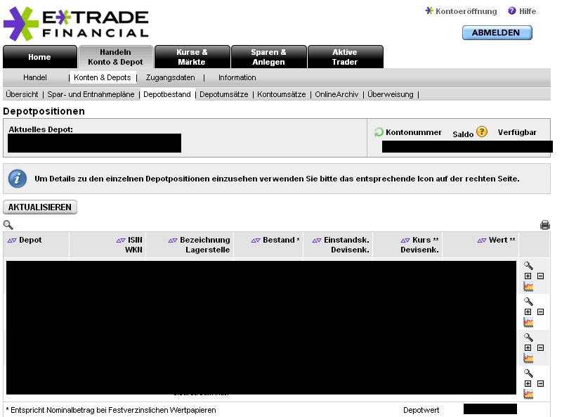 P2k1 Februar 27, 2008 Hi, ich bin grade dabei bei E*Trade ein Depot zu eröffnen und wollte mal frage was ihr bis jetzt hier für Erfahrungen gemacht habt. Die Gebühren scheinen überschaubar und einfach aufgebaut zu sein. Meine bisherigen Fragen zur Depoteröffnung (E-Mails und Anrufe) wurden schnell beantwortet / behandelt. E-Mails wurden innerhalb von 24 Stunden beantwortet. Kostenlose Hotline bis 22:15Uhr, mit echten Menschen am anderen Ende der Leitung und keinen Computer! Die Unterlagen sind ausgedruckt und soweit fertig zum verschicken. Nun wollte ich von euch mal hören was ihr von E*Trade haltet, ich finde bis jetzt "recht" wenige Erfahrungsberichte zu diesem Anbieter. mfg Diesen Beitrag teilen Link zum Beitrag
