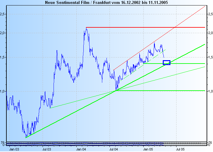 die aktie habe ausgesucht,weil die auf für mich interessant wirkt!seit april 2003 hat die aktie einen langfristigen aufwärtstrend,und seit august einen kurzfristigen aufwärtstrend!des weiteren spekuliere ich auf WM 2006 und hoffe dass die firmen sich präsentativ zeigen wollen und damit die firma(Neue Sentim Film AG,WKN 534140) beauftragen für sie so einen kleinen spot zu drehen!
