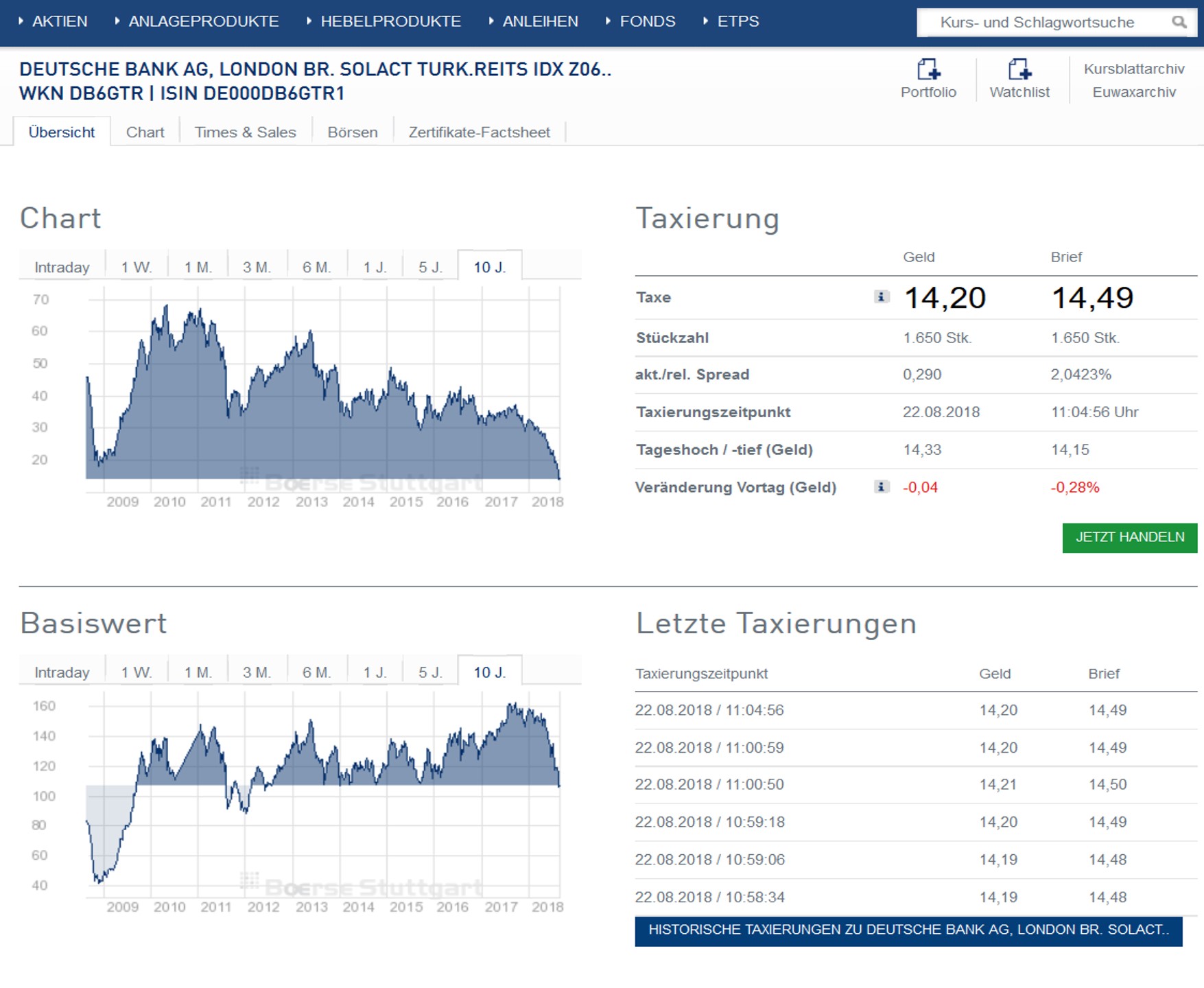 Die Deutsche Bank hat ein Index-Zertifikat (DB6GTR) auf den Solactive Turkish REITs im Angebot. Eventuell lohnt es sich, da einzelnen Komponenten mal durchzugehen. Schaut man sich den Kursverlauf des Index in der Finanzkrise 2008 an, gibt es allerdings noch reichlich Luft nach unten.