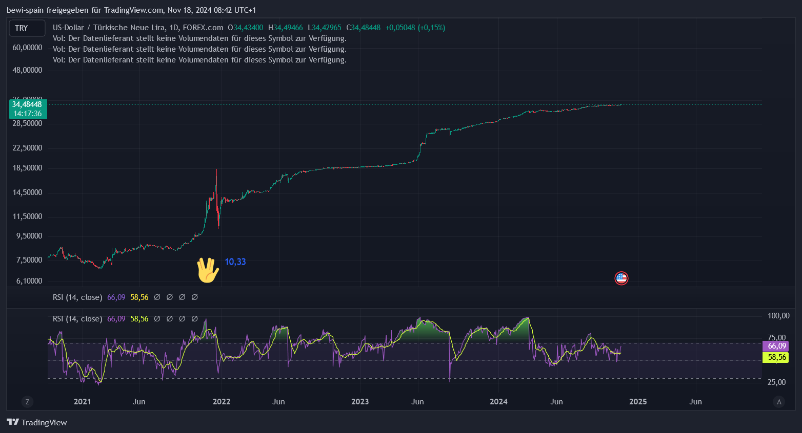 kimimaro April 3, 2024 · bearbeitet April 3, 2024 von kimimaro vor 13 Stunden von Laser12: Moin, Zinsen bei 100% Inflation auf 50% zu erhöhen empfinde ich nicht als massiv. Bis die Zinserhöhungen wirken, dauert es bekanntlich etwas.. Kann sein, dass wir nun den "Boden" erstmal erreicht haben ..hinzu jetzt der Sommer Urlaub kommt. Für eine Kurzfristige Wette , dass Lira auf 30-32 Fällt ist nicht unrealistisch , meiner Meinung nach? https://www.onvista.de/devisen/Euro-Tuerkische-Lira-EUR-TRY Von 35,51 auf 34,40 aktuell seit ca : 1 Woche. Diesen Beitrag teilen Link zum Beitrag