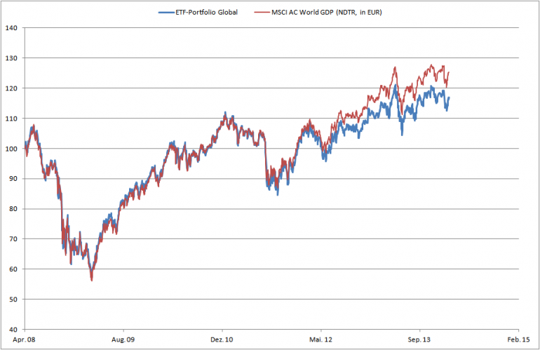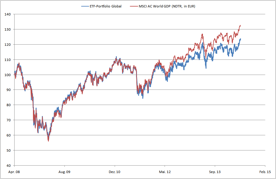 Chemstudent Juni 5, 2014 Hallo Chemstudent, könntest Du bitte mal wieder ein Update reinstellen ? Herzlichen Dank. Gerne. Im Grunde gibt's nicht viel neues. Alles wie gehabt. Seit reichlich 2 Jahren (Mai 2012) erhöht sich der Rückstand zum Index stärker als durch die Kosten zu erwarten wäre. Das sieht man recht gut in der zweiten Grafik, ebenso in den 1-Jahresrenditen. Dazu habe ich mal eine weitere Grafik angehängt, bei der ich mit einem roten Strich den Mai 2011 in den rollierenden Renditen markiert habe. Man sieht recht gut, dass die geglätteten rollierenden 1-Jahresrenditen nach Mai 2011 (also die Zeiträume von Mai 2011 bis Mai 2012 und so weiter) deutlich nach unten gehen, und niedriger sind, als im ganzen Zeitraum davor (daher die schwarze horizontale Linie). Woran das liegt, weiß ich nicht. Ich hatte vor einiger Zeit bei Veritas mal nachgefragt (siehe hier: https://www.wertpapier-forum.de/topic/17656-etf-portfolio-global/?do=findComment&comment=791708). Klar ist: Der Fonds hat offiziell nicht vor, den MSCI ACWI GDP abzubilden, ist etwas anders zusammengesetzt etc. pp. Kurzum: Hat eine andere "Methode" als MSCI. So könnte bspw. das Hinterherhinken der Emerging Markets ggü. den DMs ein Grund sein, was zeitlich gut passt (ungefähr seit dem Rückgang Mai 2012 hinken die EMs hinterher) Da der Fonds (wie von veritas ausgesagt) wöchentlich rebalanced, werden die stärker gestiegenen DMs daher immer wieder zurückgenommen. Ich denke also, hier gibt es einige Gründe, die aber nicht alle per se und auf Dauer negativ sind. (anders als bspw. die hohen Kosten, die sind logischerweise immer schlecht. ) Diesen Beitrag teilen Link zum Beitrag