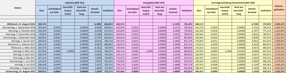 Die Frage ist dann, wieviel Geld musst Du in die Fonds einzahlen, damit die Werte zum 31.08 2017 passen. Oder andersherum ausgedrückt, wieviel von Deinem Monatsbeitrag i.H.v. 40,63 € floss in diese Fonds. Dabei unterstelle ich, das zum jeweils Börsenersten eines Monats Anteile gekauft werden und die Ausschüttungen ohne Kostenbelastung Dir zuflossen.  KURZANTWORT: von den 40,63 € flossen etwa 17,22 € in die Fonds.  Die Rechentabelle sieht so aus: