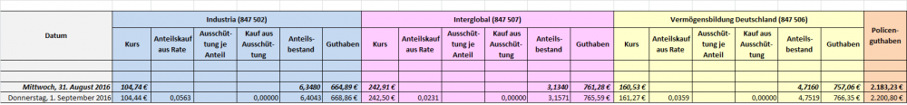 Fondsguthaben insgesamt (01.09.2016): 2.183,23 (Industria = 664,89 / Interglobal 761,28 / Ver_bil. D 757,06)