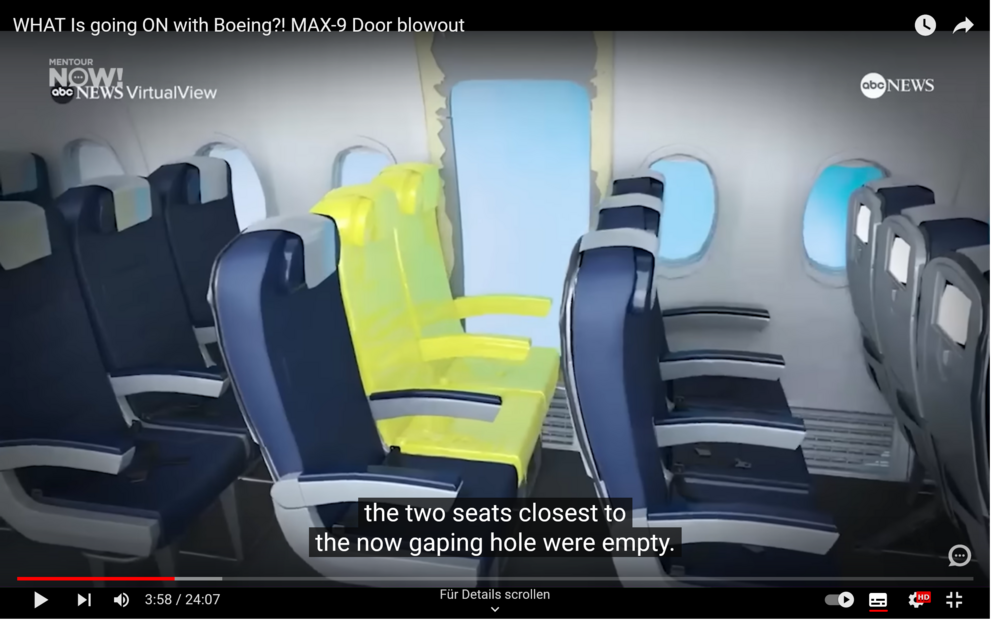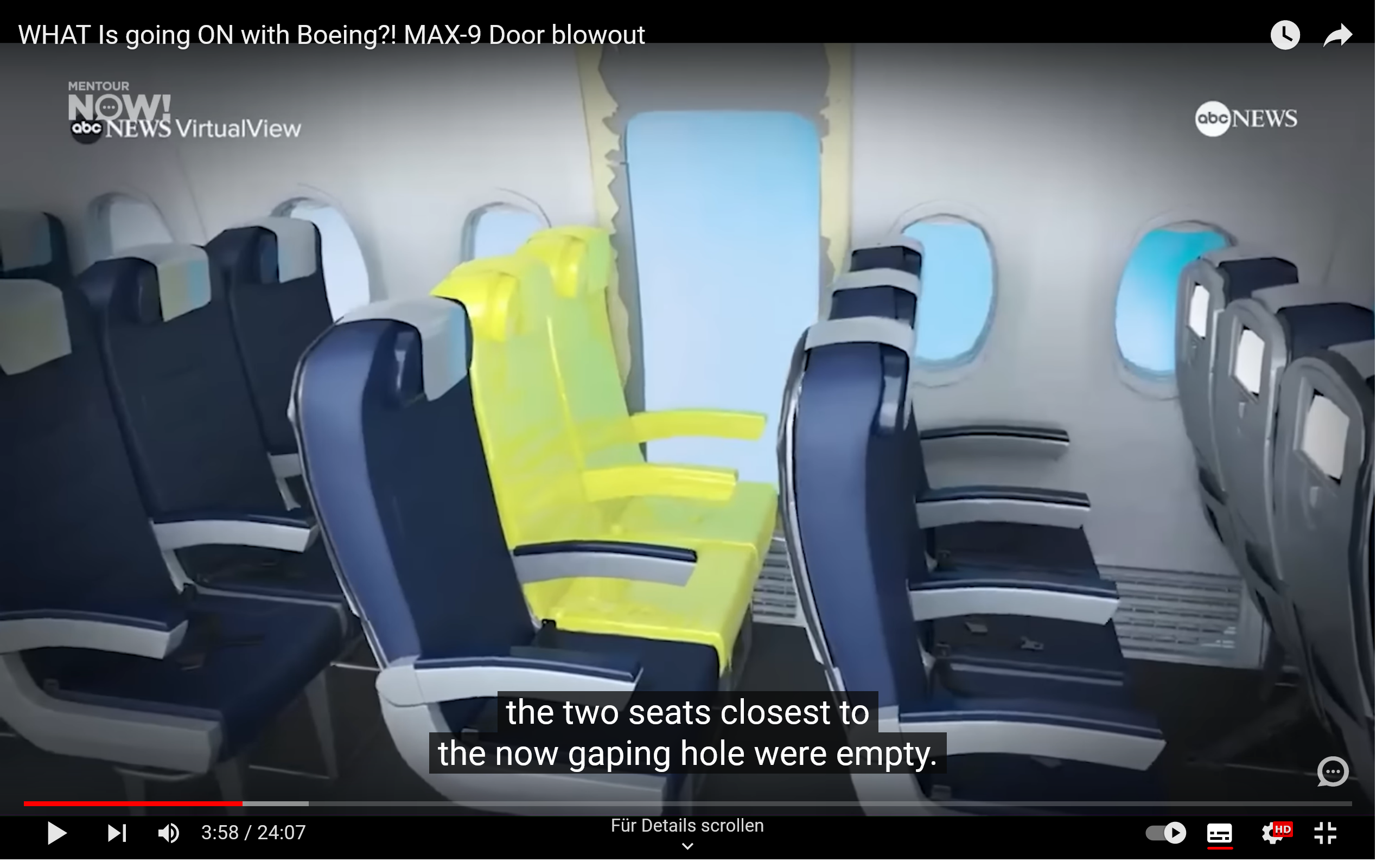 Vor einigen Tagen hat ein Flugzeug (Boeing 737 MAX-9) während des Flugs eine verdeckte Tür (Door Plug) verloren. Ohne ernsthafte Folgen. Die Fensterplätze waren nicht besetzt. "This stuff matters"