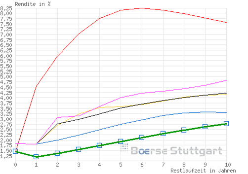 Bärenbulle Juli 21, 2011 · bearbeitet Juli 21, 2011 von Bärenbulle Das liegt aber allein an den PIGS-Staaten. Bei deutschen Staatsanleihen krümmt sich da überhaupt nichts: Für die Erkenntnis hättest Du Dir aber nicht die Mühe mit der zugegebenermassen sehr interessanten Grafik machen müssen. Die Deutsche Zinsstruktur ist nämlich der grüne Bodensatz ganz unten im Bild. Imposant: Heute senkt sich der Mittelteil schlagartig um weit über 100 Basispunkte. Die neue Lösung scheint vor allem für die Mittelläufer milde auszufallen. Das kurze und das lange Ende kann da noch nicht so ganz Schritt halten. Diesen Beitrag teilen Link zum Beitrag