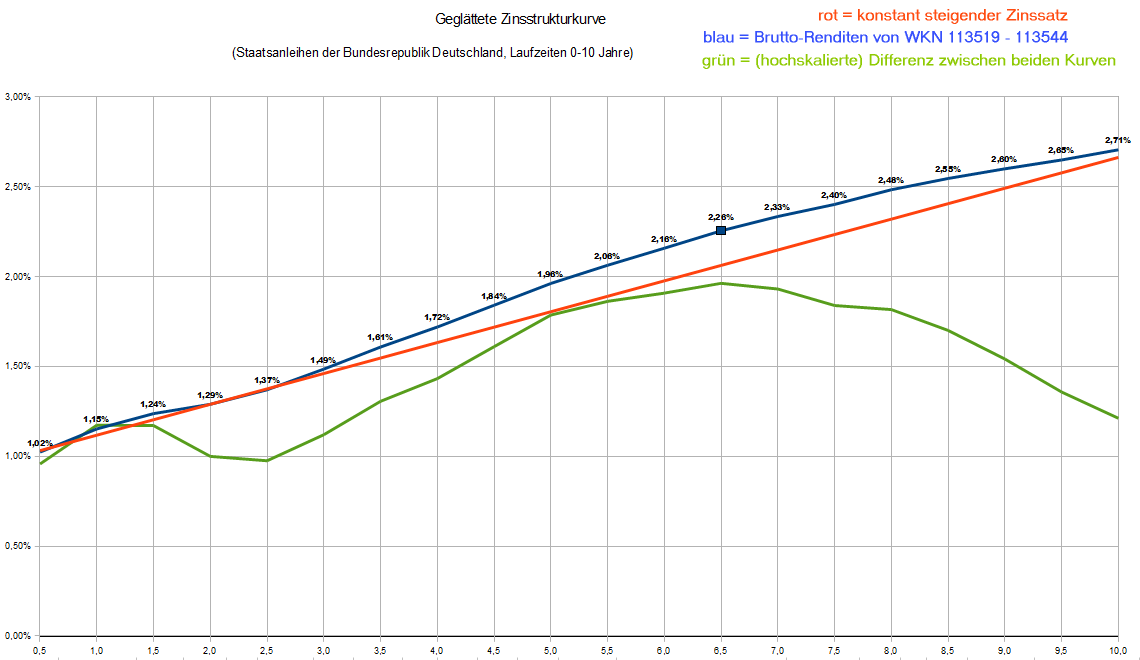 Karl Napf Juli 21, 2011 Für die Erkenntnis hättest Du Dir aber nicht die Mühe mit der zugegebenermassen sehr interessanten Grafik machen müssen.Das war keine Mühe, das ist ein Abfallprodukt meiner Anleihen-Bewertung. Wenn ich Rumänien 2015 mit Ungarn 2016 und vor allem mit Rumänien 2018 vergleichen will, dann normalisiere ich deren Rendite auf Basispunkte über einer Bundesanleihe derselben Laufzeit, wobei ich die beiden benachbarten Bundesanleihen jeweils mit der Anzahl Tage an Abweichung des Fälligkeitstermins zur jeweils gegenüberliegenden Anleihe gewichte (nach dieser Spalte sortiere ich dann ganze Tabellen vergleichbarer Anleihen). Dafür muss ich diese 20 Bundesanleihen also jeweils mitführen. (Manche Websites haben solche "Rendite über Bund"-Angaben, aber dann leider mit irgend einem Kurs meist vom Vortag und nicht mit demjenigen Geld/Brief-Kurs, der für meine aktuelle Order relevant wäre.)Der "geglättet"-Anteil der Rendite-Punkte besteht darin, dass ich zu jeder Bundesanleihe die beiden Nachbarn mit jeweils 25% Gewicht in die Rendite mit hinein rechne, um eventuelle Ausreißer eines einzelnen Kurses (selten, aber nicht unmöglich) zu "bügeln". Und aus diesen Daten einen Chart in OpenOffice/Calc zu erzeugen, war irgendwann mal eine Fingerübung, weil ich den Punkt der maximalen Krümmung der Kurve sehen wollte (deshalb die grüne Kurve). Diesen Beitrag teilen Link zum Beitrag