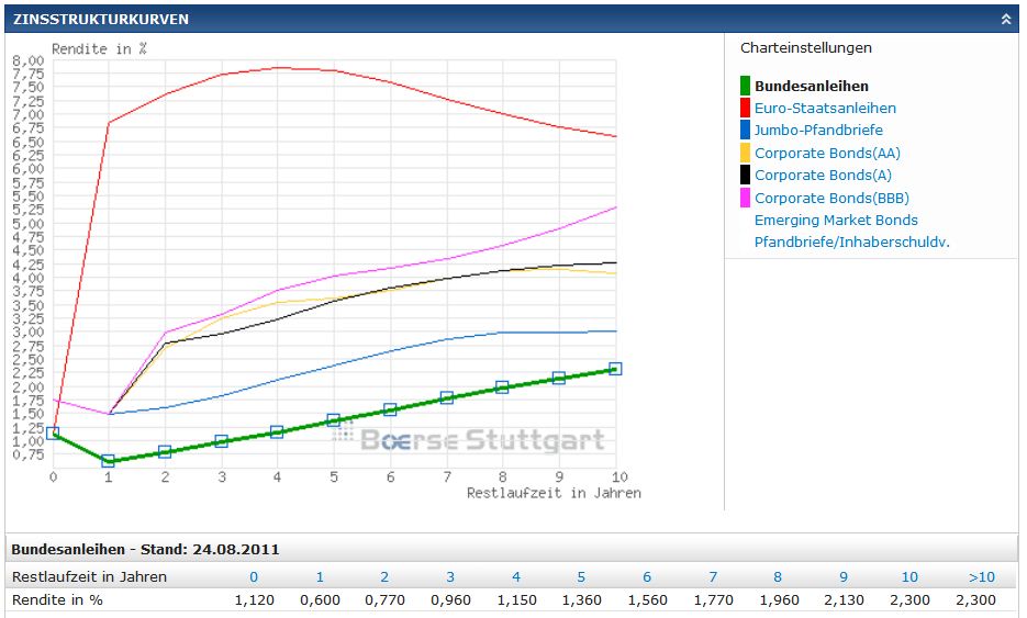 Bärenbulle Juli 13, 2011 · bearbeitet Juli 13, 2011 von Bärenbulle Die Zinsstruktur nimmt mittlerweile echt kuriose Formen an: Wenn man bedenkt wieviel Werte alleine durch die sinkenden Anleihenkurse in der Eurozone vernichtet wurde, dann ist das schon extrem. Entgegen den QE-Effekten hat das dann doch auch stark deflationäre Effekte (zumindest für Altervorsorge und Lebensversicherungen der Durchschnittsbürger). Wie extrem kann das eigentlich noch werden? Ein bisschen übertrieben scheint mir das schon. Ist der Markt nicht derzeit über-hysterisch? Irgendwie erinnert mich die Stimmung an den Anleihenmärkten stark an die Untergangsstimmung 2008/2009 an den Aktienmärkten. Diesen Beitrag teilen Link zum Beitrag