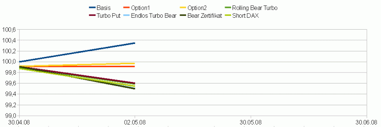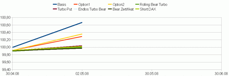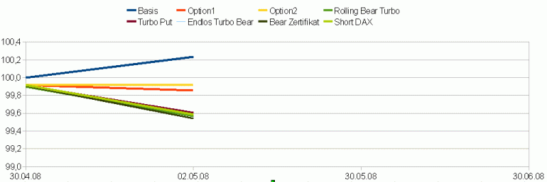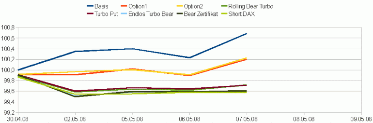 Letzten Freitag war der DAX etwas unter meinen Einstandskurs gefallen. Für einen Tag waren die Optionsscheine deshalb in Führung gegangen. Ein echter Test war dies aber noch nicht, dafür war das Minus zu klein. Ansonsten gibt es wenig Neues zu berichten. Der Rolling Bear Turbo hat seine Rückstand ausgebaut. Alle anderen liegen extrem dicht bei einander. Ich drücke jetzt mal die Daumen für fallende Kurse, zumindest mal für eine Woche ;) .